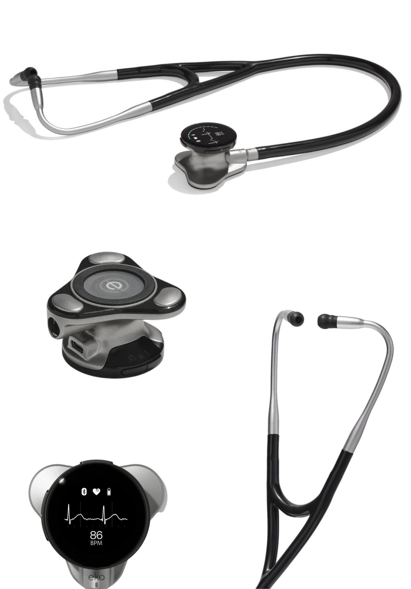 • Optional: Eko+ AI (subscription via the app): automatic detection of murmurs and atrial fibrillation